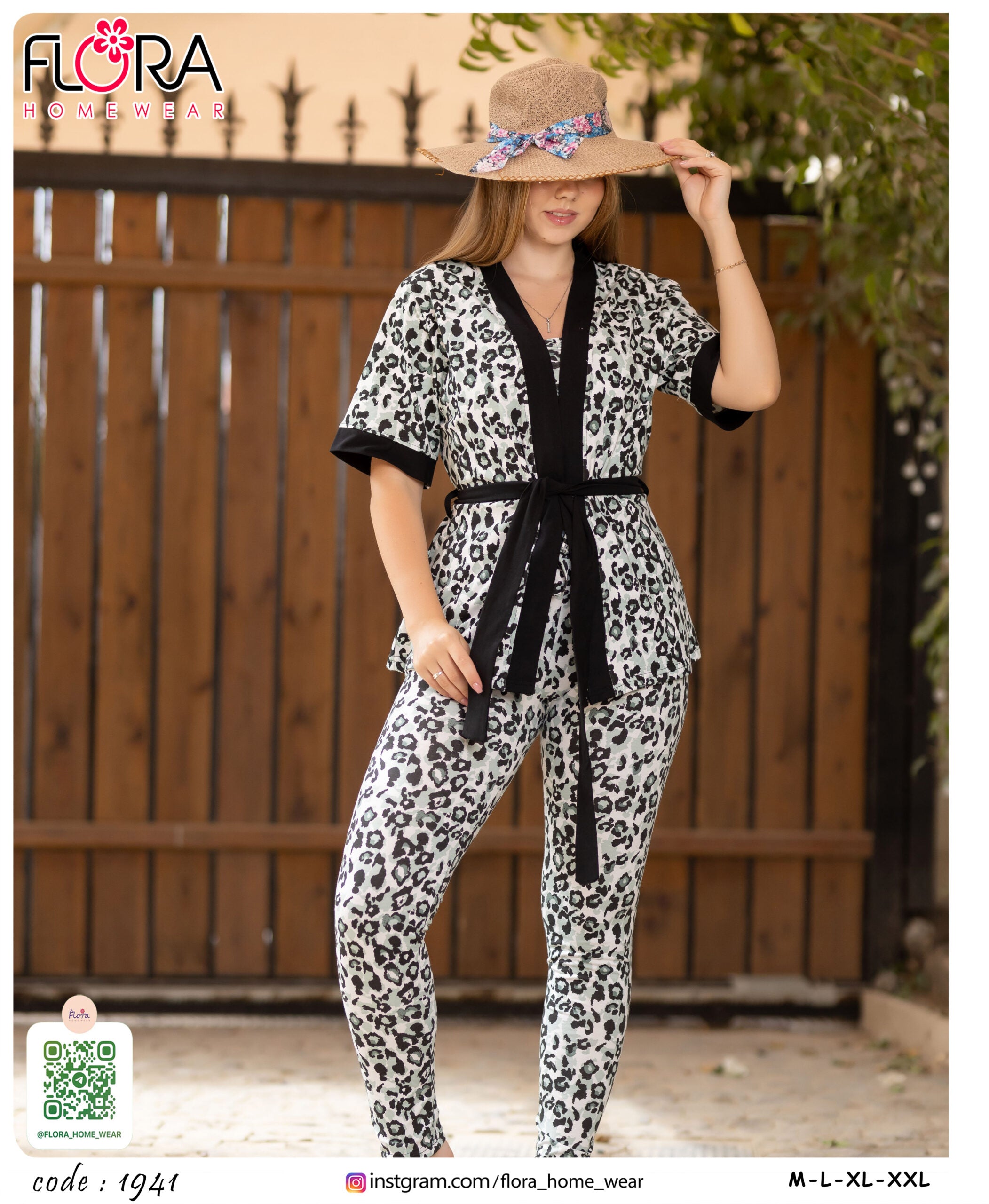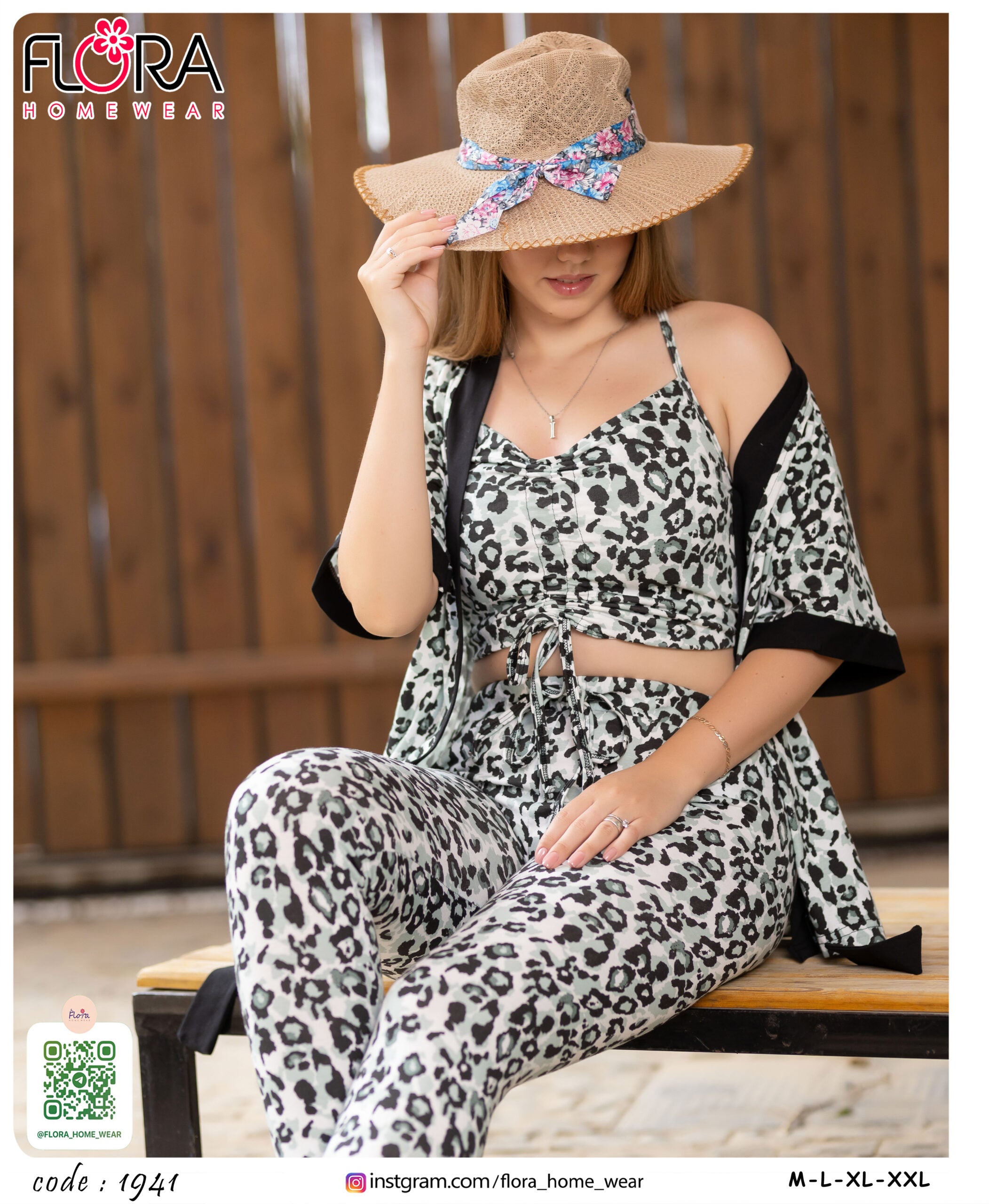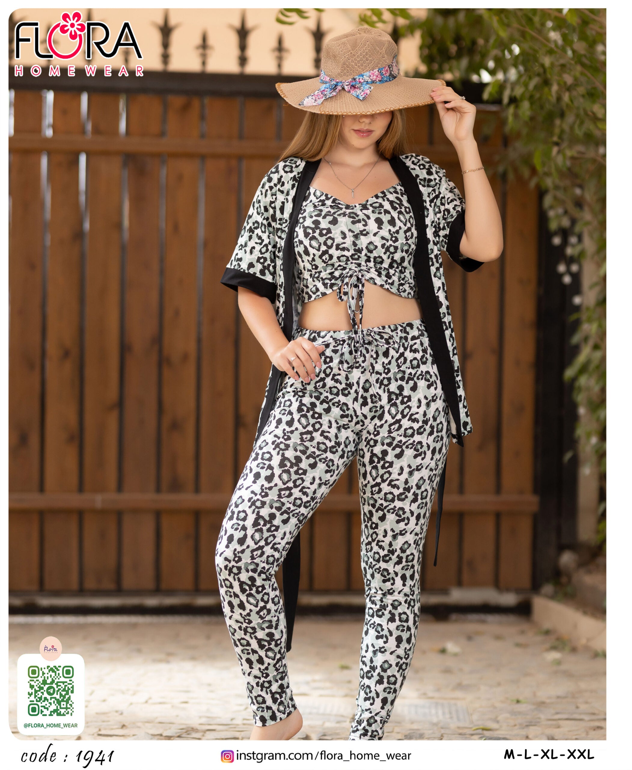 استمتعي بإطلالة مفعمة بالأنوثة والجاذبية مع هذا الطقم العصري من Flora Homewear، المصمم بنقشة النمر الرائجة ولمسة من النعومة والراحة. يتكون الطقم من: