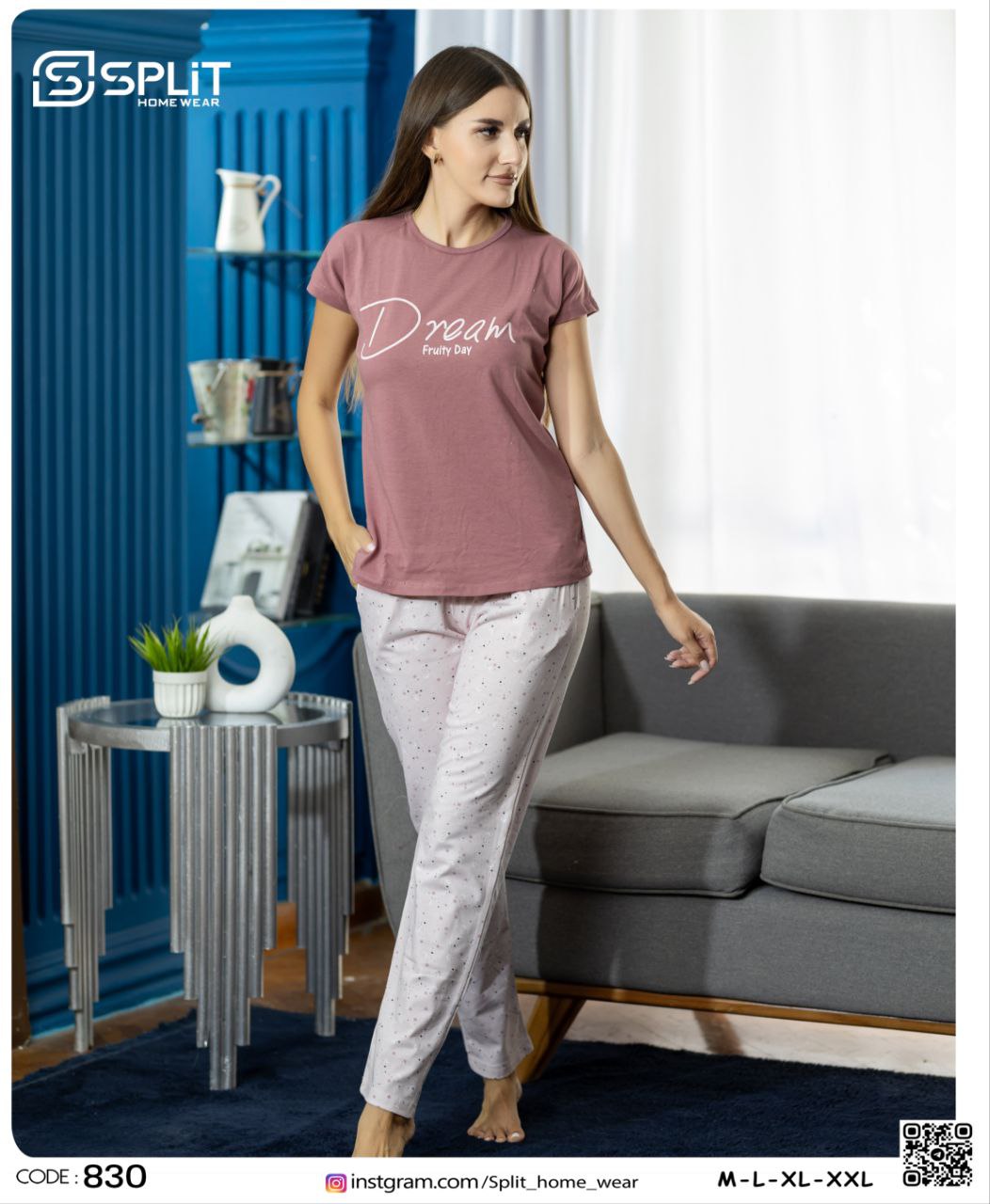 بلوزة بأكمام قصيرة بلون وردي هادئ مطبوع عليها "Dream – Fruity Day" تمنحك لمسة من الأناقة البسيطة، مع بنطال طويل بنقشة ناعمة يمنحك دفء وراحة طوال اليوم أو أثناء النوم.